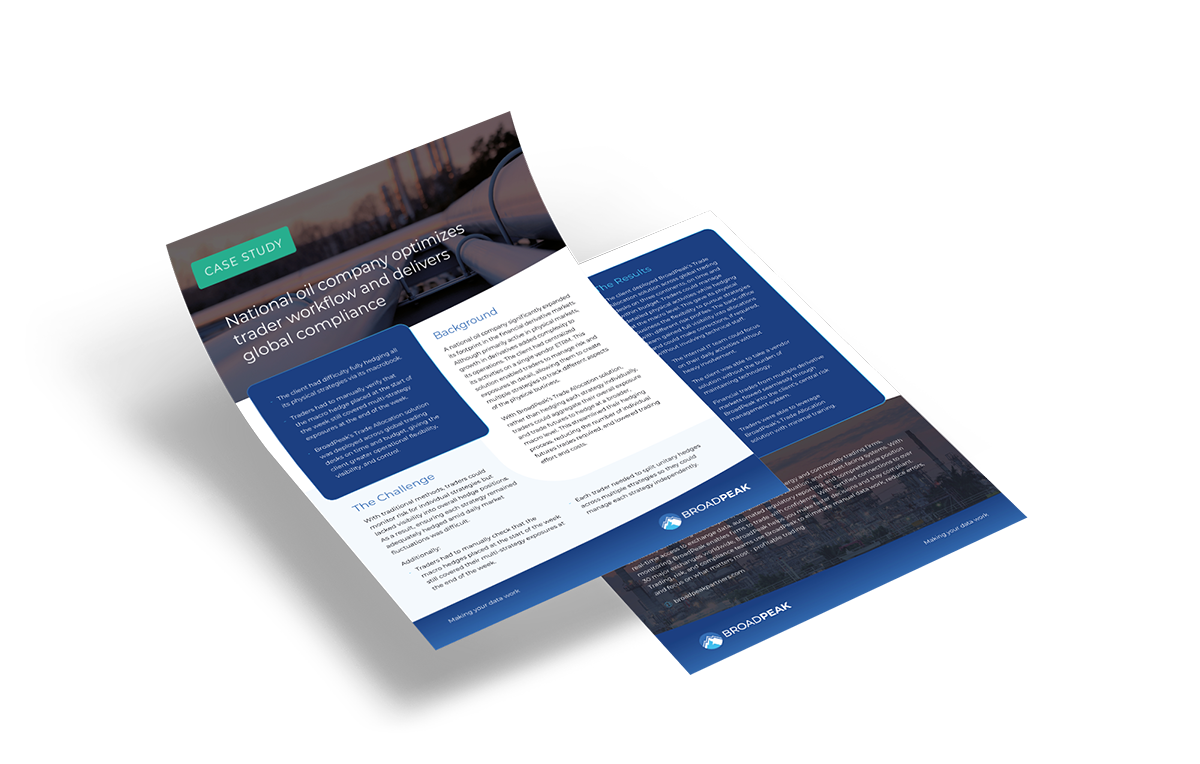 The client had difficulty fully hedging all its physical strategies via its macrobook. Traders had to manually verify that the macro hedge placed at the start of the week still covered multi-strategy exposures at the end of the week. BroadPeak’s Trade Allocation solution was deployed across global trading desks on time and budget, giving the client greater operational flexibility, visibility, and control.